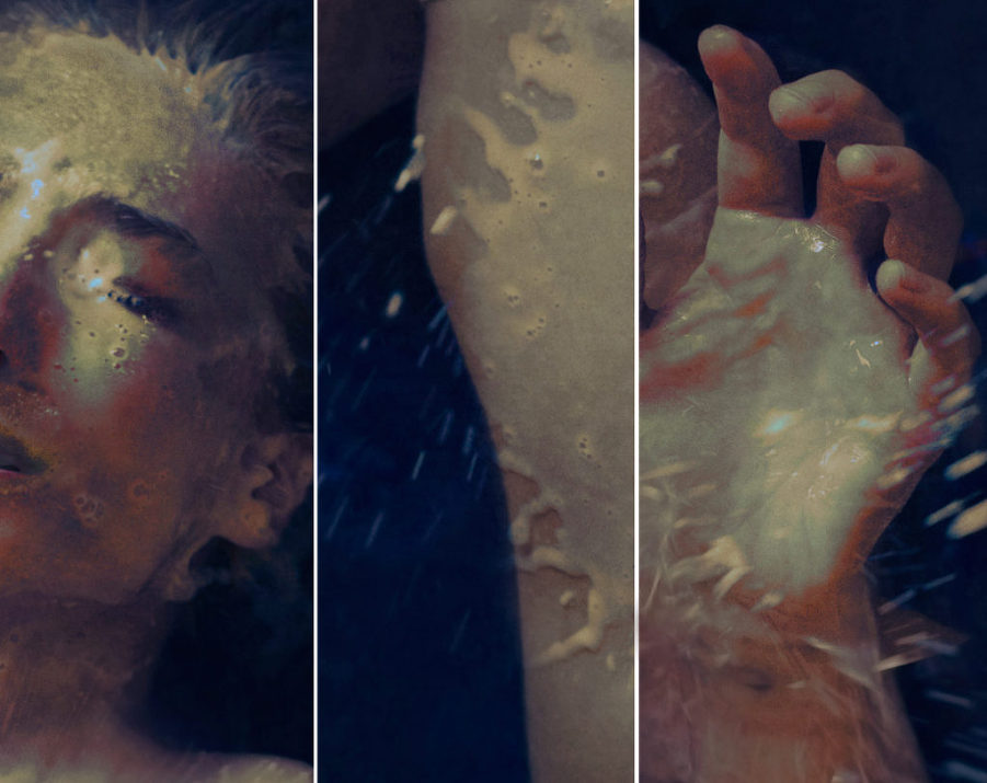 I pieced together various splashes onto my body and then manipulated the color/lighting to look more selective. I wanted a painterly feeling in this image. I also added hair on from a separate shot that I took before the milk portions were photographed, knowing that my hair would get soaked. Thankfully my shower was only a few feet away.