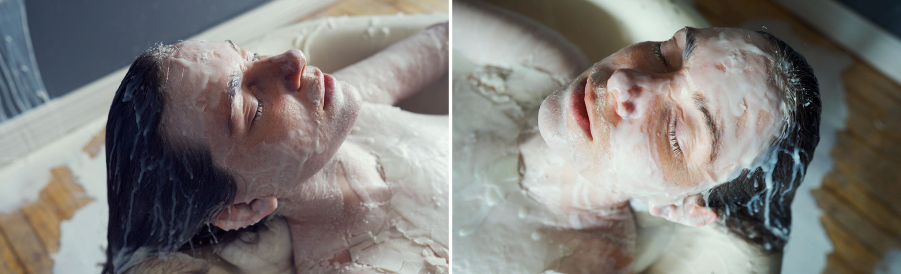 Once the bathtub was in place, the wax was ordered and I had finished my testing to see what the wax would dry like and if it was safe to put on my skin, I asked my friend to come model for the image. In these situations, where you are asking someone to do something completely insane, I feel you must turn to friends first.
